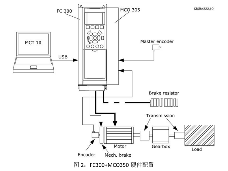 注:當在閉環磁通矢量模式下使用 FC300 時,編碼器必須安裝在電動機主軸上,而在非閉環磁通矢量模式下使用 FC300 時,反饋編碼器可安裝在任一傳動機構;