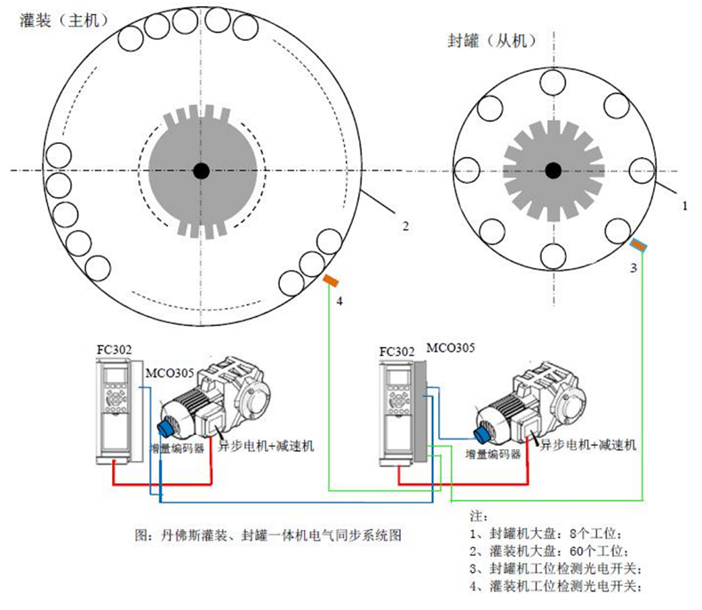 丹佛斯 FC302+MCO305 為灌裝封口組合機提供了易于安裝和調試的電氣同步解決方案,以下作詳細說明。