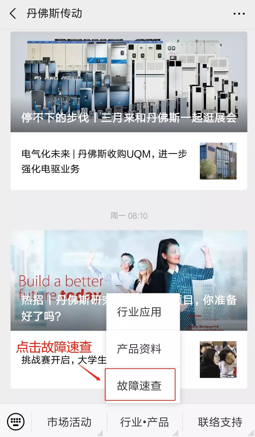 1.在丹佛斯傳動公眾號菜單欄,點擊【行業(yè)·產(chǎn)品】,選擇“故障速查”,即可進入故障速查首頁。