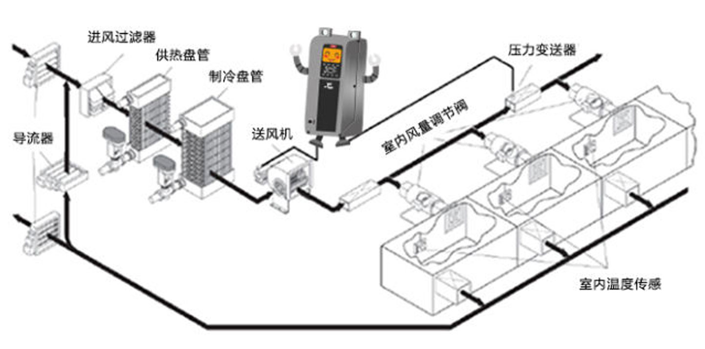 在假定送風主管道溫度恒定的前提下,當室內溫度傳感器感測到溫度與控制器設定溫度不匹配時,控制器將改變室內風量控制閥的開度,進而調整從送風主管道進入室內的風量,改變室內溫度。