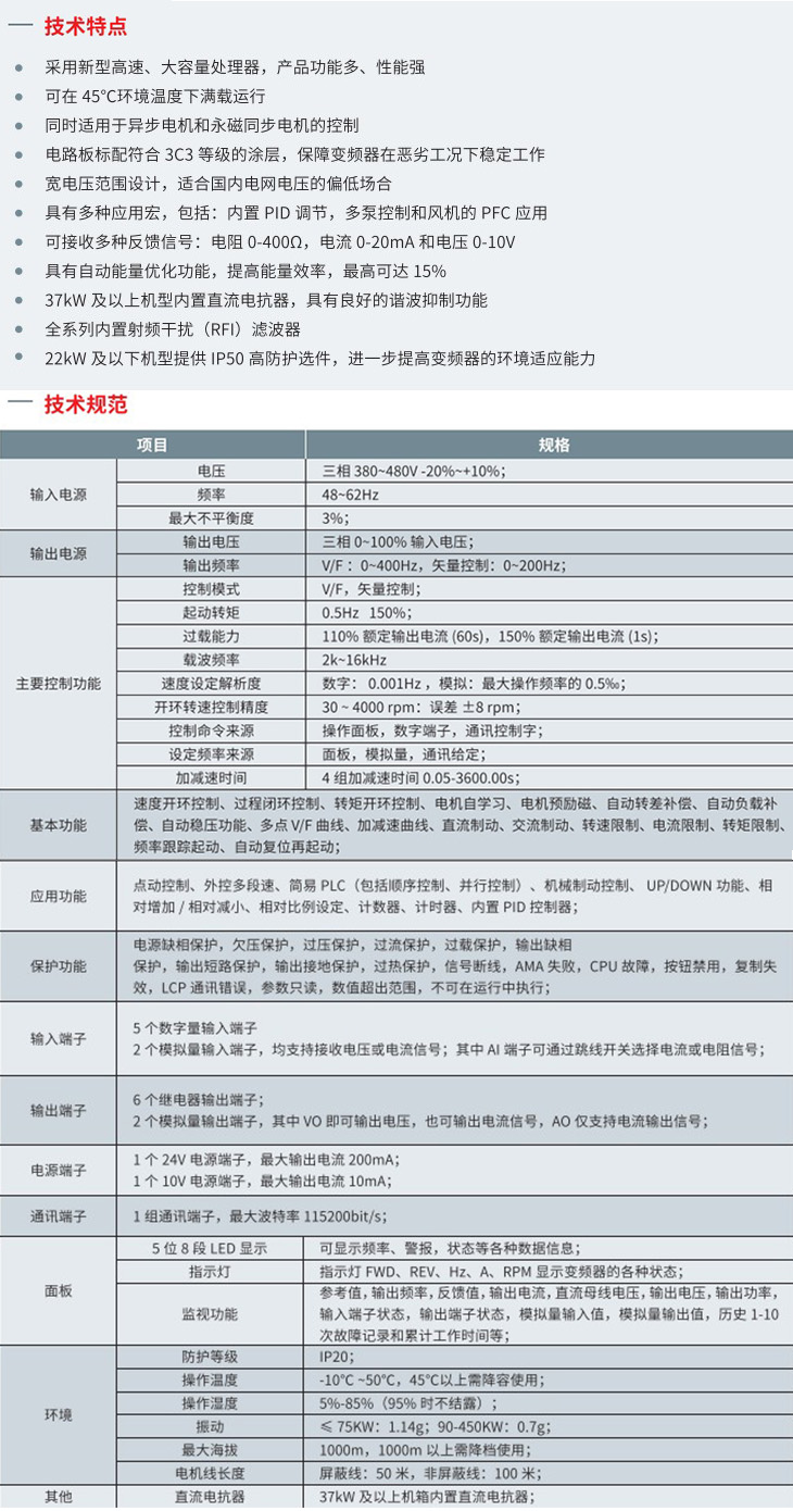 具有多種應(yīng)用宏,包括:內(nèi)置PID調(diào)節(jié),多泵控制控制和風機的PFC應(yīng)用
