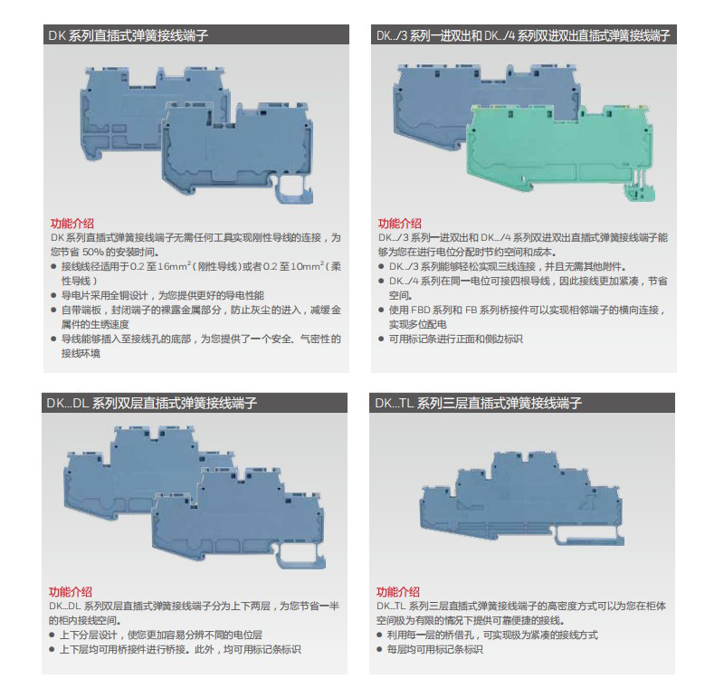DK系列直插式彈簧接線端子無(wú)需任何工具實(shí)現(xiàn)剛性導(dǎo)線的連接,為您節(jié)省50%的安裝時(shí)間。