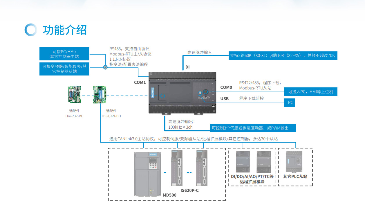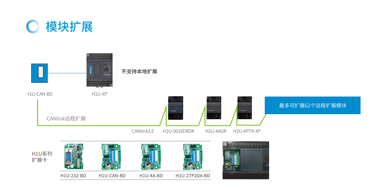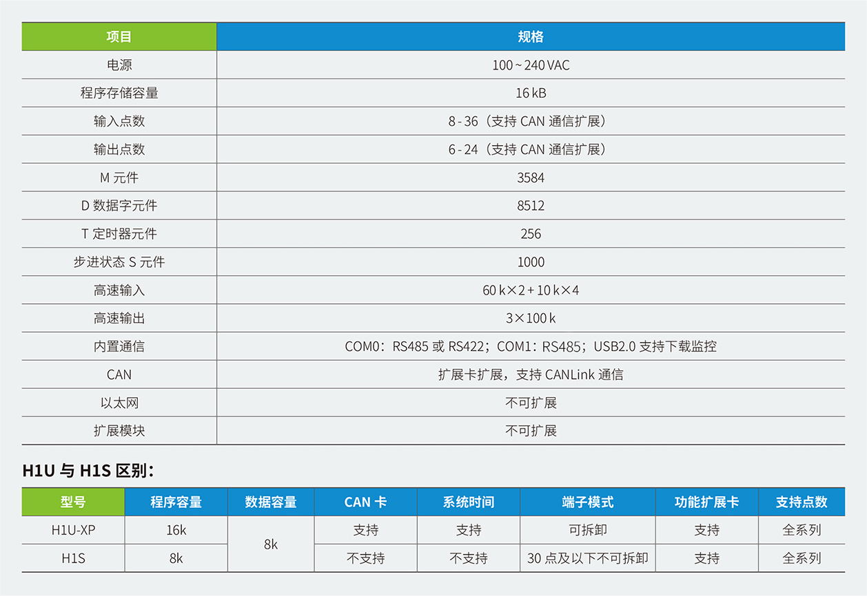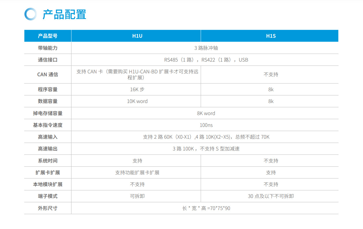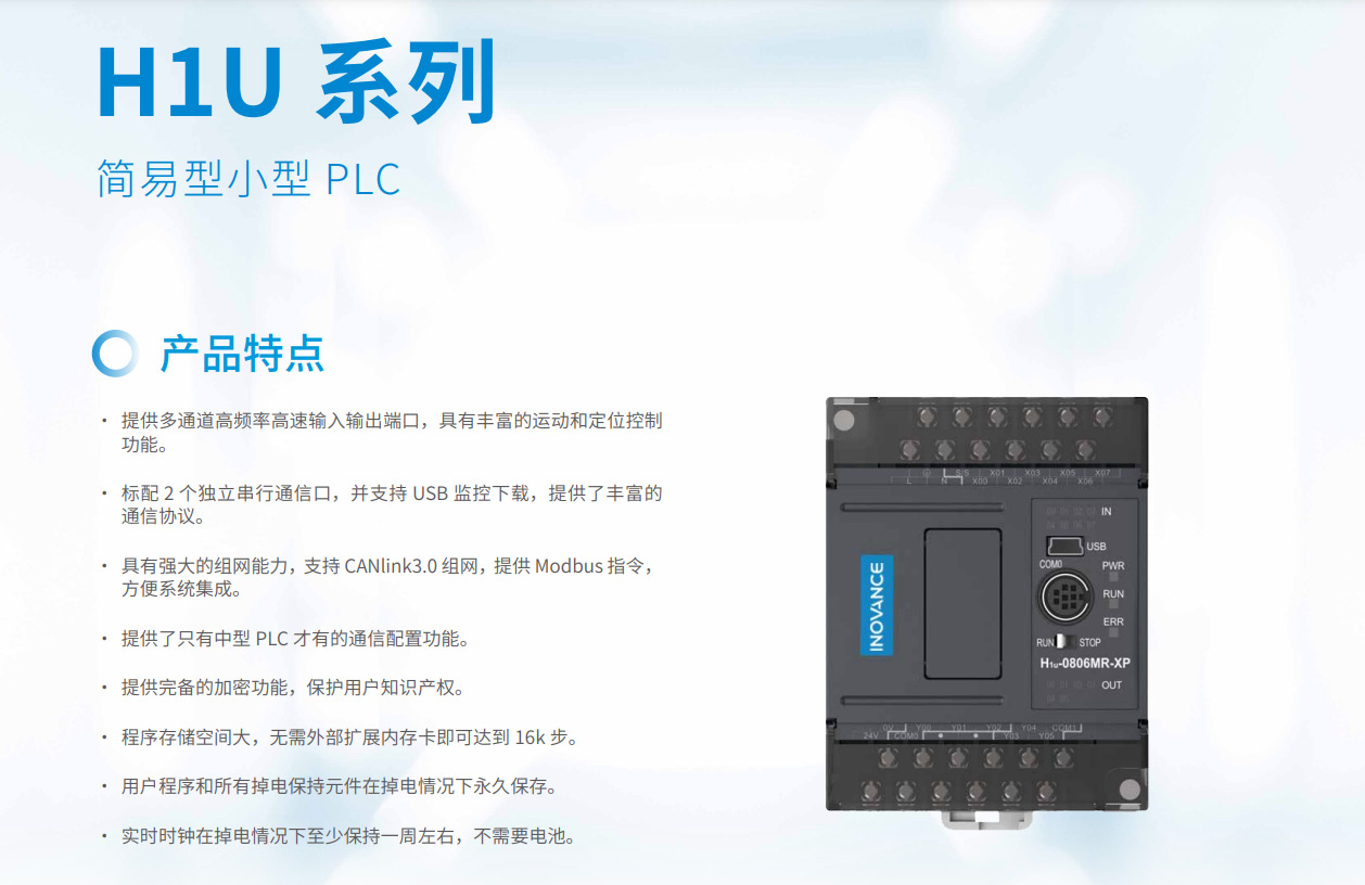 H1U系列PLC 隸屬匯川小型PLC 經(jīng)濟(jì)型系列,其主要特點(diǎn)具備小體積,大程序容量,并具備3 軸高速100K 脈沖以便實(shí)現(xiàn)高精度定位。支持CANlink 擴(kuò)展卡擴(kuò)展H2u 系列的遠(yuǎn)程擴(kuò)展模塊來豐富IO。該系列PLC 點(diǎn)數(shù)覆蓋14~60 點(diǎn)。是小型自動(dòng)化設(shè)備高性價(jià)比的選擇。