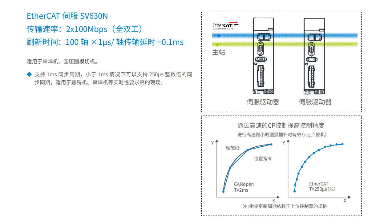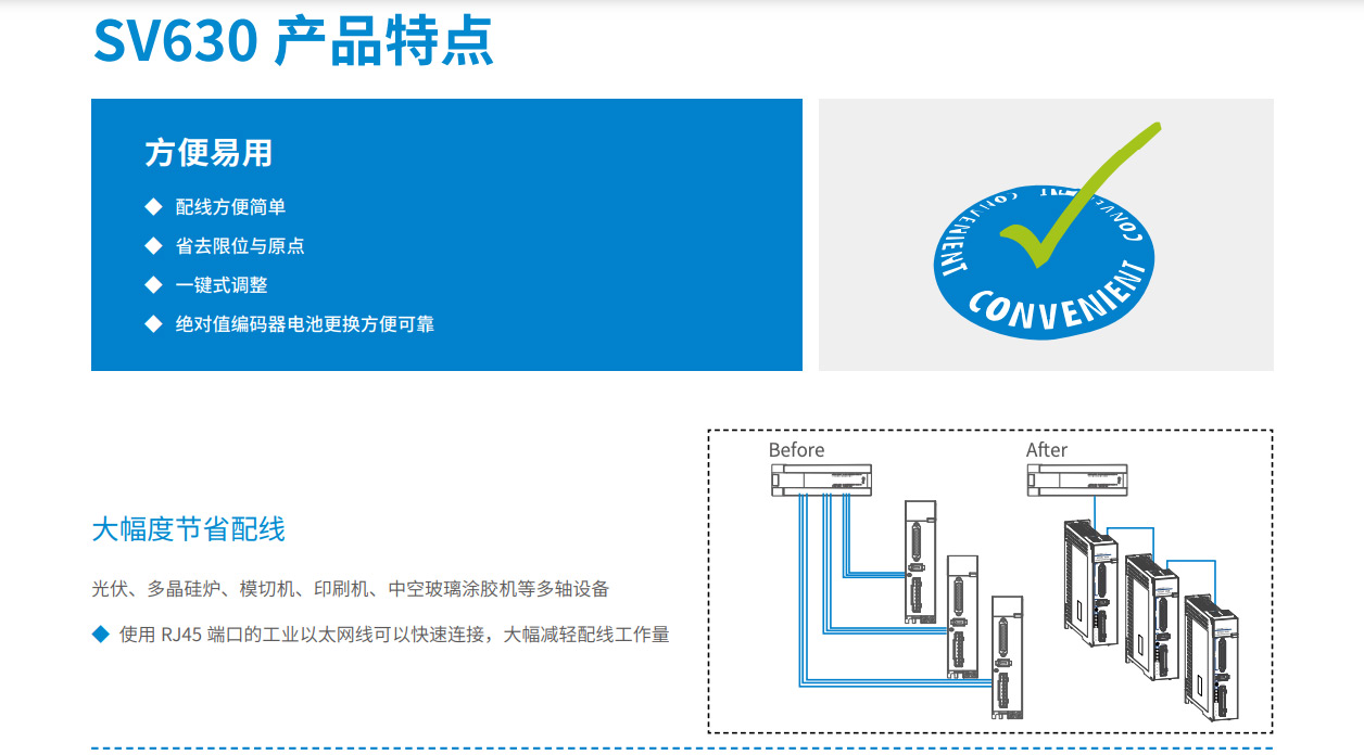 SV630 系列伺服是匯川技術(shù)研制的高性能中小功率的交流伺服產(chǎn)品。該系列產(chǎn)品功率范圍為0.05kW ~ 7.5 kW,采用以太網(wǎng)通訊接口,支持EtherCAT 、Modbus、CANopen 和CANLink 等通信協(xié)議,采用對應(yīng)的通信接口,配合上位機(jī)可實(shí)現(xiàn)多臺伺服驅(qū)動器聯(lián)網(wǎng)運(yùn)行。