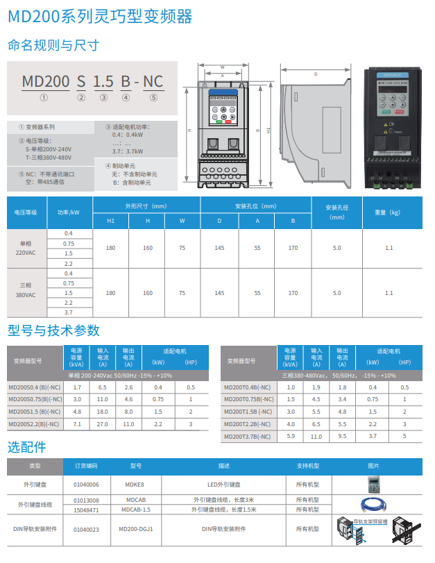 MD200系列緊湊型變頻器是匯川技術基于小功率、小體積、低成本的市場需求,針對性推出的單相220 VAC 和三相380 VAC 迷你變頻器。MD200 采用V/F 控制方式、無速度傳感器矢量控制方式(SVC),具有高功率密度、高EMC 規格設計、高防護性能等顯著優勢。