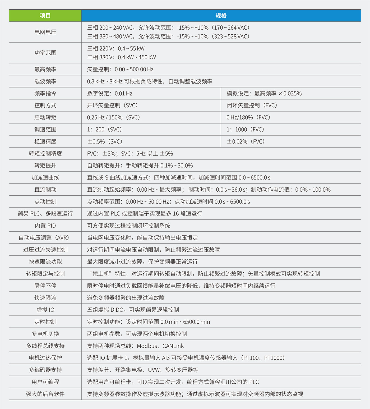 MD500E 系列變頻器是一款通用高性能電流矢量變頻器,主要用于控制和調(diào)節(jié)三相交流同步電機的速度和轉(zhuǎn)矩,是MD380E 系列的技術(shù)升級產(chǎn)品。MD500E 采用高性能的矢量控制技術(shù),低速高轉(zhuǎn)矩輸出,具有良好的動態(tài)特性、超強的過載能力、增加了用戶可編程功能及后臺監(jiān)控軟件,通訊總線功能,支持多種PG 卡等,組合功能豐富強大,性能穩(wěn)定。